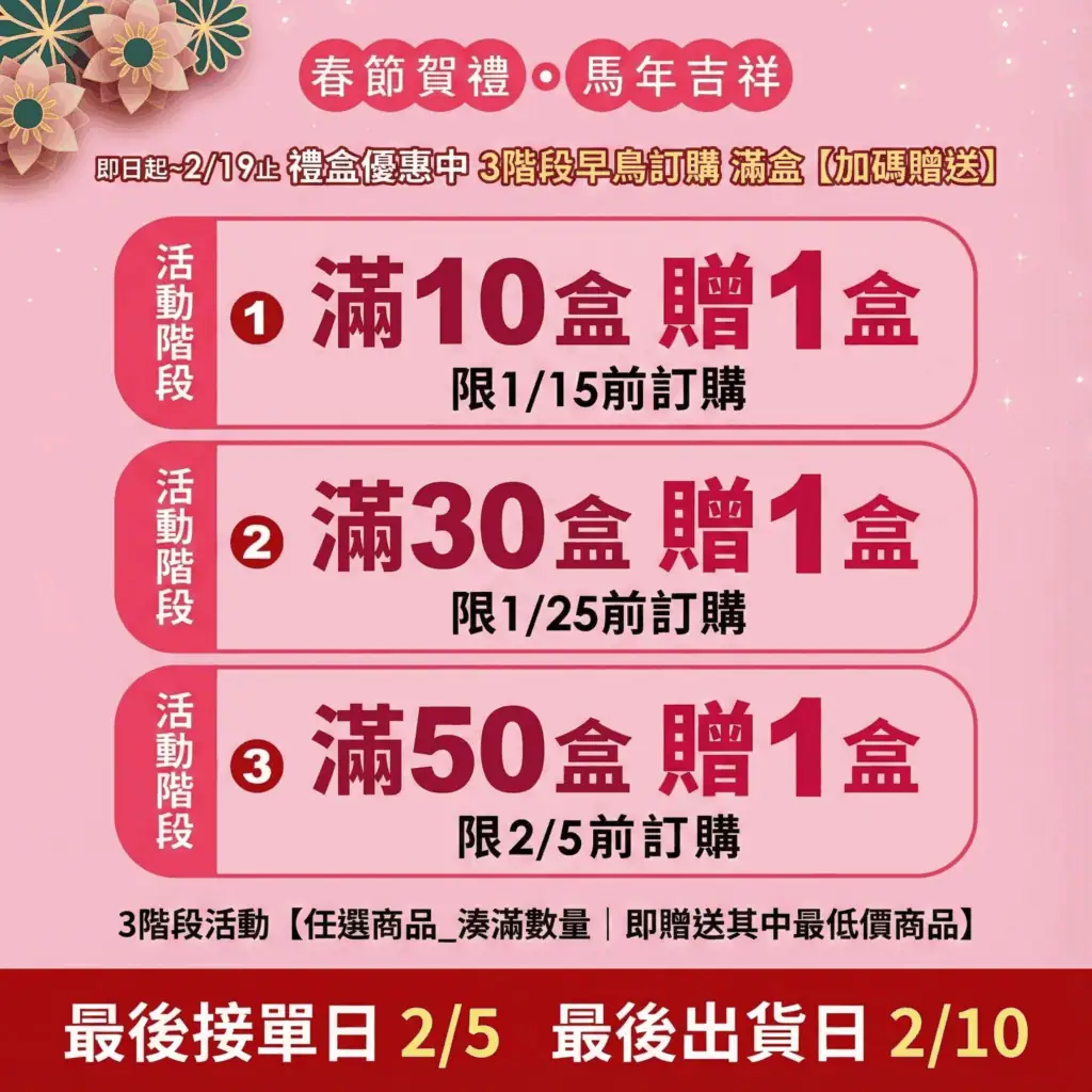 過年前兩週是全台物流高峰,尤其是像麥仕佳這種熱銷品牌,手工製作產能有限,熱門款式的新春禮盒常在一月就被預訂一空。提早下單不僅能確保拿到最新鮮的批次,還能避開物流延遲的焦慮。