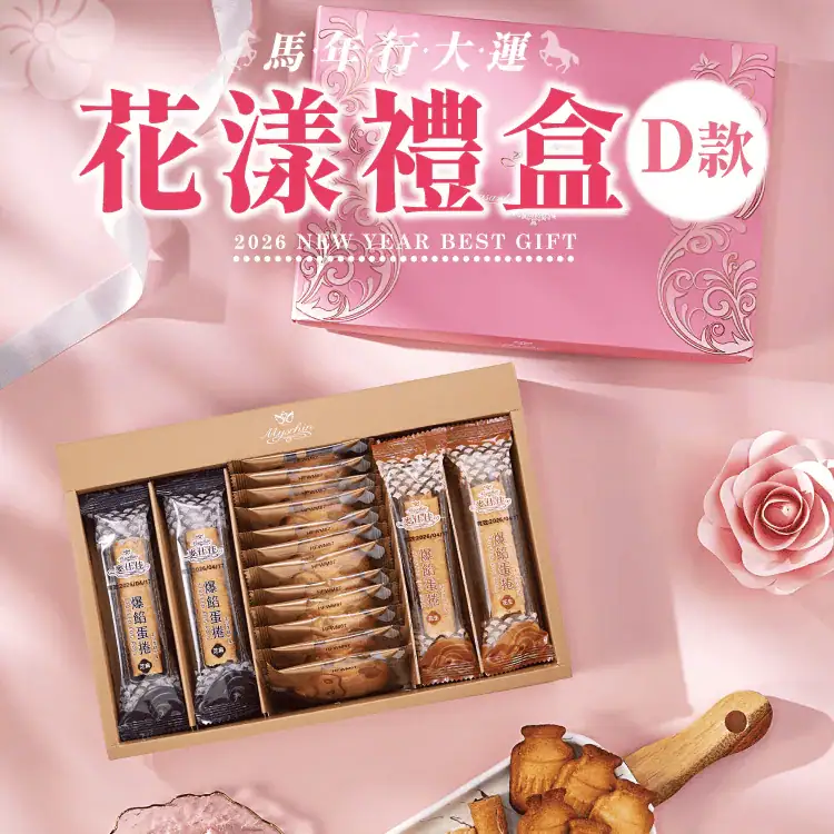 D款禮盒精選了品牌長期熱銷的三款點心:包含香氣濃郁的芝麻蛋捲與花生蛋捲,以及質地酥鬆、散發純粹乳香的原味牛奶餅乾。蛋捲選用優質雞蛋與奶油製作,入口酥脆且帶有紮實的堅果香氣;牛奶餅乾則是以低糖比例烘焙,口感輕盈而不膩口。