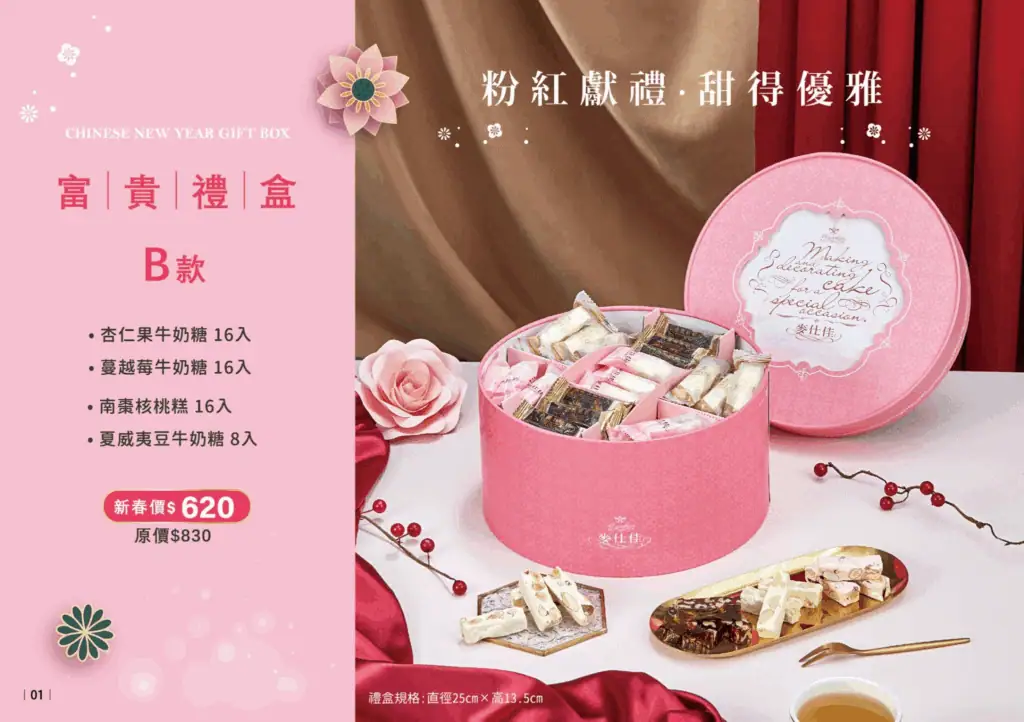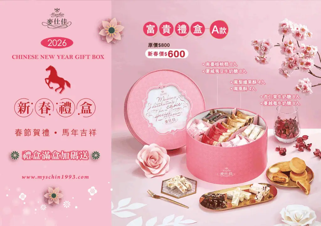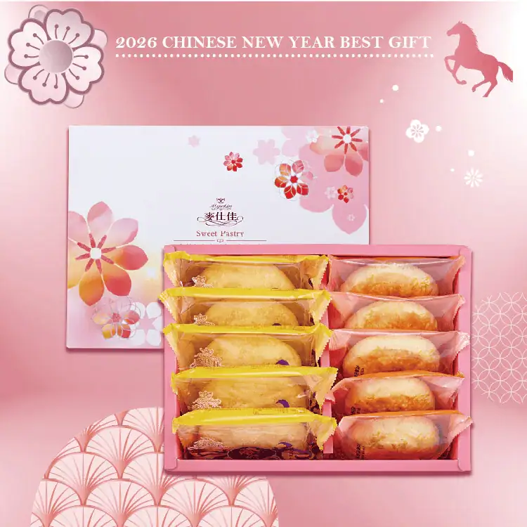 麥仕佳針對 2026 馬年推出的「富貴禮盒 A 款」,是一款集合六款經典中式點心與手作糖果的綜合性春節禮盒。外盒設計以「圓滿」為核心意象,象徵新的一年富貴吉祥,是企業拜訪或親友贈禮的實惠選擇!