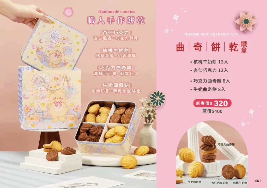禮盒內容包括經典的巧克力與牛奶曲奇,以及加入堅果增添食感的核桃牛奶餅與杏仁巧克力餅。每一款餅乾皆強調甜而不膩、香氣純正,無論是作為新春期間居家備用的茶點,或是拜訪親友時的小禮,都是相當實惠且受歡迎的選擇。簡約而不失節慶氛圍的包裝,不僅能妥善保護餅乾完整,更傳遞了「吃甜甜、過好年」的誠摯祝福。